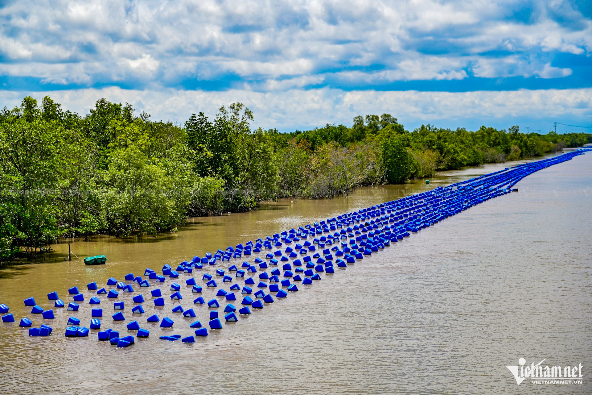 Εικόνα γαρίδας και καβουριού στη διασταύρωση της γέφυρας Ca Mau. Στην οποία, οι γαρίδες είναι η κύρια βιομηχανία που βοηθά τους ανθρώπους να πλουτίσουν, συμβάλλοντας σημαντικά στην τοπική οικονομία.