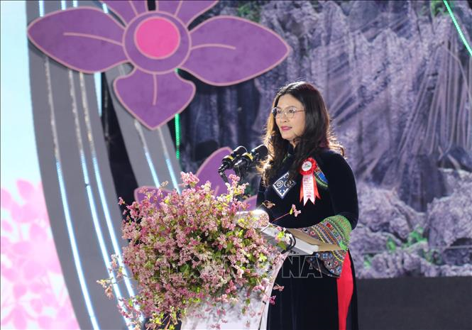 | Η κα Vuong Ngoc Ha, Αντιπρόεδρος της Λαϊκής Επιτροπής της Επαρχίας Tuyen Quang, μίλησε στο 11ο Φεστιβάλ Λουλουδιών Φαγόπυρου. |