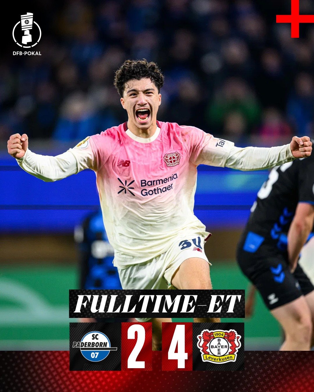 Αλλά η Πάντερμπορν δεν τα παράτησε. Ισοφαρίστηκε σε 1-1 στο 90ό λεπτό και μάλιστα προηγήθηκε με 2-1 στην αρχή της παράτασης, αφήνοντας τη Λεβερκούζεν στα πρόθυρα του αποκλεισμού.