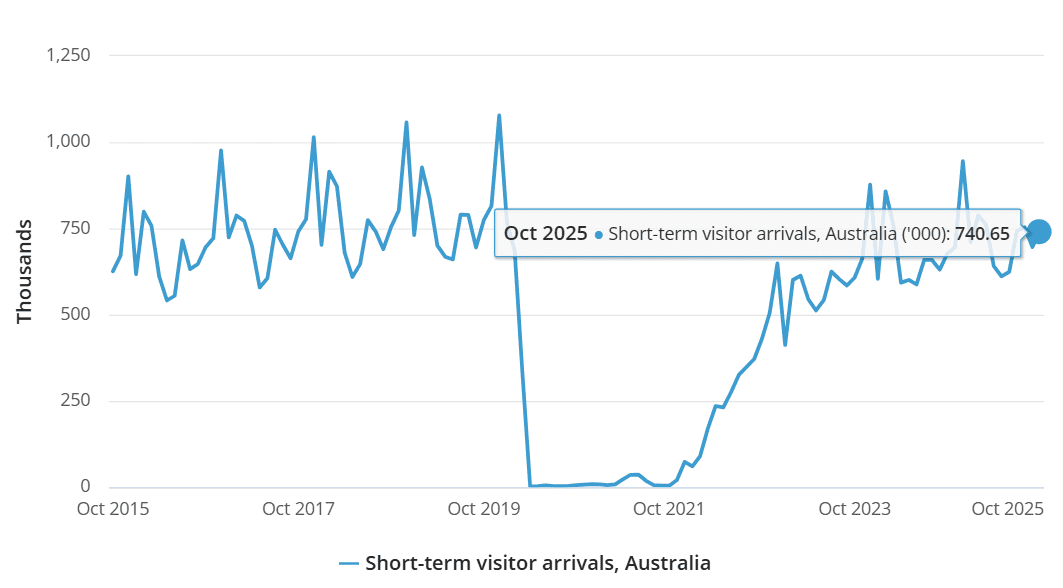 According to the latest figures from the Australian Bureau of Statistics (ABS), the total number of overseas visitors to Australia in October 2025 reached 2.1 million, an increase of 8.3% compared to the same period in 2024. Of these, 1.3 million were Australian citizens returning home for short-term stays (+7.9%); and 740,600 were international visitors to Australia for short-term stays (compared to 696,500 the previous month), an increase of over 63,000, equivalent to +9.3% compared to the same period in 2024.