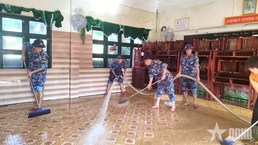 On October 31, the Technical Support Center (Navy Region 3) mobilized more than 100 officers and soldiers, along with specialized vehicles such as trucks and water pumps to help people overcome the consequences of rain and floods. With the spirit of "Helping people is an order from the heart", officers and soldiers of the Technical Support Center (Navy Region 3) helped Lam Quang Thu Primary School (Hoa Vang Commune), Vang Anh Kindergarten (Ngu Hanh Son Ward), Ly Thuong Kiet Primary School (Dien Ban Ward) dredge mud, clean hundreds of school supplies, and clean 20,000 square meters of classroom floors and more than 100,000 square meters of campus area...