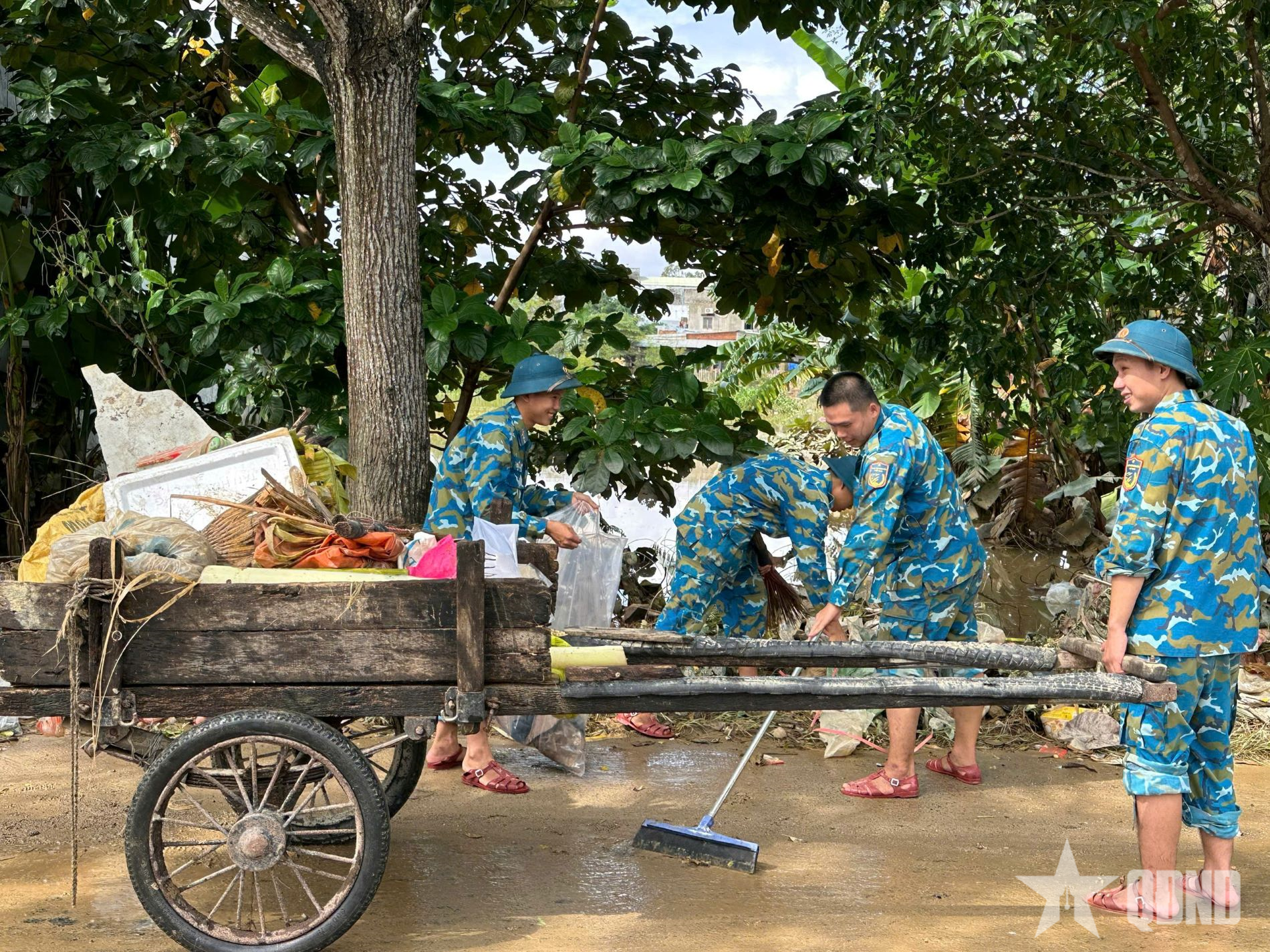 | Officers and soldiers of Missile Regiment 282 (Division 375, Air Defense - Air Force) clean the environment and collect waste after the flood. Photo: LE PHUC |