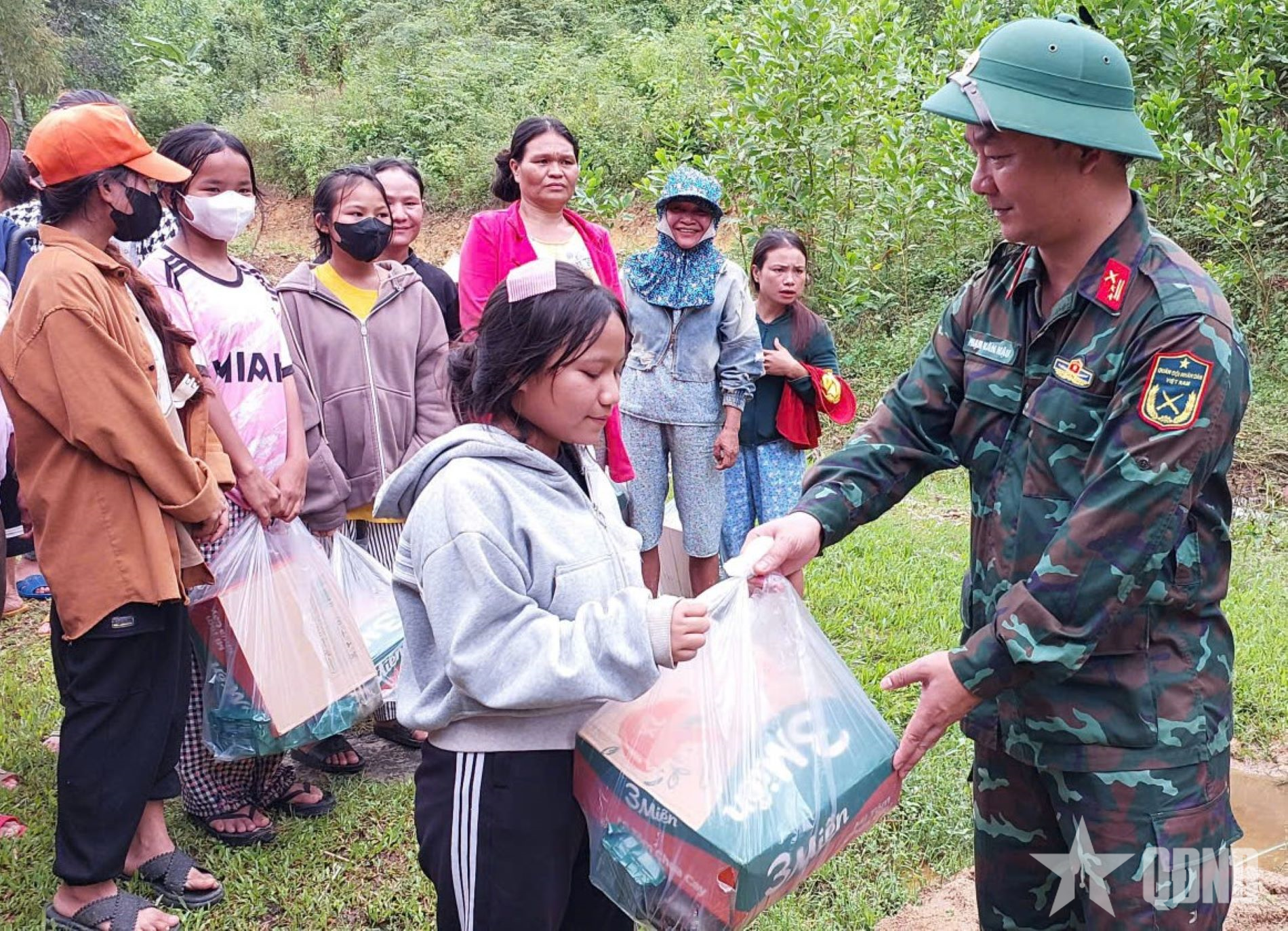 In response to the urgent needs of people in areas isolated by floods and landslides, on the morning of October 31, following the direction of the Chief of Military Region 5 Command, Lieutenant Colonel Pham Thanh Hai, Deputy Political Commissar of the 270th Engineer Brigade, directly commanded officers and soldiers to cross mountains and mud, coordinate with the locality and the Defense Command of Region 3 - Tra My to march into isolated villages of Tra Tan commune (Da Nang city) to transport relief goods, helping people overcome the consequences of landslides. Overcoming difficult terrain and traffic disruption, officers and soldiers of the units transported 460 gifts (including banh chung, bread, drinking water, instant noodles, dry food, clothes, medicine) to hand to people in the villages of Song Y, Ngoc Giap, Ngoc Tu (Tra Tan commune).