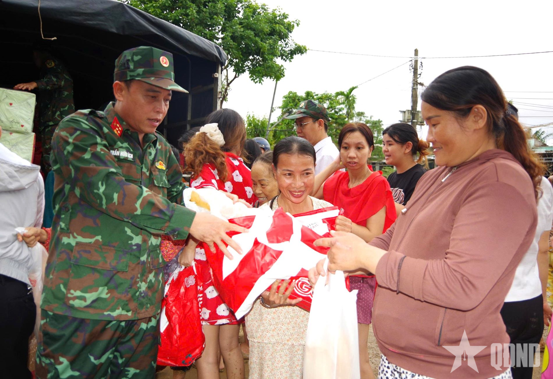 To share the difficulties with the areas that suffered heavy losses during the rain and floods, the Da Nang Military Command coordinated with the Department of Industry and Trade of Da Nang City to transport and distribute 6 tons of rice to support people in flooded areas at the Defense Command of Area 2 - Thanh My and the Defense Command of Area 3 - Tra My. On the afternoon of October 31, Colonel Tran Huu Ich, Commander of the Da Nang Military Command and comrade Nguyen Tan Hai, Deputy Director of the Department of Industry and Trade of Da Nang City visited, encouraged and presented nearly 300 gifts and essential necessities such as: Drinking water, milk, bread to help people in Tay An village, Go Noi commune to soon stabilize their lives.