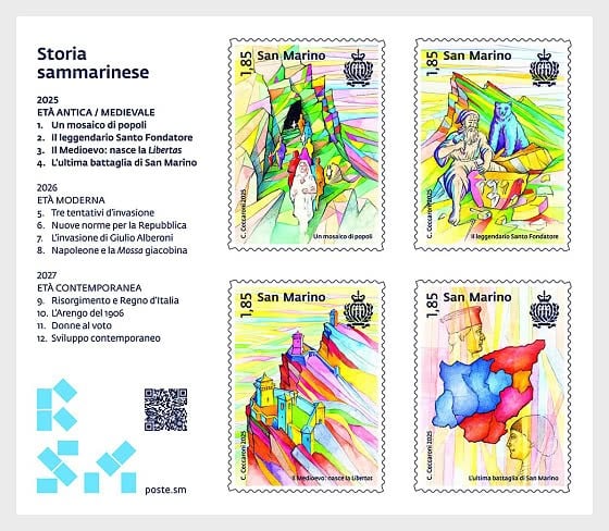 The set of four stamps, displayed on a 122 x 106 mm collector's stamp cover, depicts the Sanctuary of Tanaccia on Mount Titano, Saint Marino the stonemason, three ancient towers and the territorial expansion after the Treaty of Fossombrone. Each stamp shows the following information: the face value “1.85”, “San Marino”, the Coat of Arms of the Republic, a legend, the name of the designer and the year 2025. On the right side of the collector's stamp cover, at the top, is the legend “Storia Sammarinese” with a list of all four stamp themes for 2025, along with the RSM logo, the website of the San Marino Post Office (poste.sm) and a QR code.