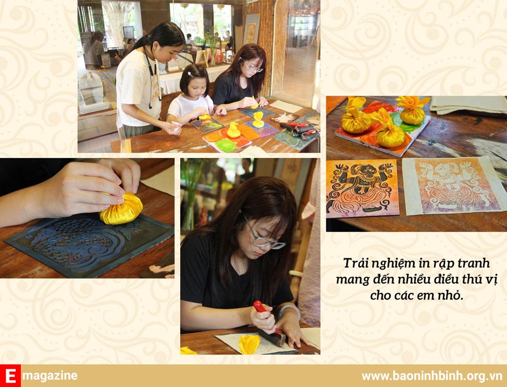 In the experiential space organized by the Center for Research and Experimental Art (ERCA) at Trang An Eco-tourism Area, visitors can personally make a traditional print on Do paper, from the stages of mixing colors, placing molds, using fabric-covered molds and rollers to print the painting. Ms. Nguyen Tu Phuong Chi, ERCA Project Assistant, shared: “We design the engravings based on motifs that are typical of the ancient capital of Hoa Lu, such as excerpts from the Dragon Bed - a national treasure currently kept at King Dinh Temple with dragon hand motifs, sun, cloud, fire, etc. motifs, or the image of the snakehead fish, a typical king fish in the lowlands, engraved on the Dragon Bed. In addition, modern graphic themes depicting plants, flowers, and some special animals in Cuc Phuong National Park and Van Long Nature Reserve, such as butterflies and white-legged langurs, are also being exploited and introduced to visitors. Along with that, volunteers will introduce historical, cultural, and natural knowledge, conveying the story behind each motif, so that participants can understand the context of its creation, the symbolic meaning and cultural value of each pattern. That is also a way to help the heritage become closer, especially to the younger generation.”