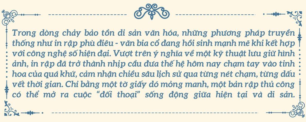 Pattern printing is a method of accurately preserving original details, while creating an emotional and aesthetic approach to heritage. Each handmade pattern becomes a connecting thread between artifacts and communities, between traditional art and modern technology. On the sheets of Do paper imbued with the marks of time, the spirit of heritage is awakened, appearing vividly in the exhibition space and spreading into the memories of those who are walking through the long miles of heritage.