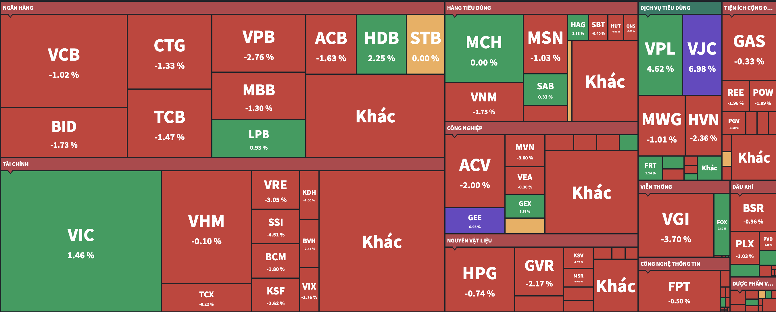 Looking at the heat map of the entire market, in the largest capitalization group, we can only see green in VIC, HDB, VPL and VJC.
