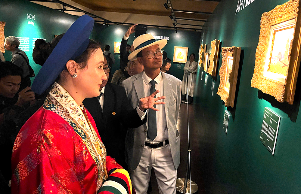 | The public visits the exhibition of paintings "Sky, mountains, water" by King Ham Nghi in Hue City, March 2025. Photo: LE HIEU |