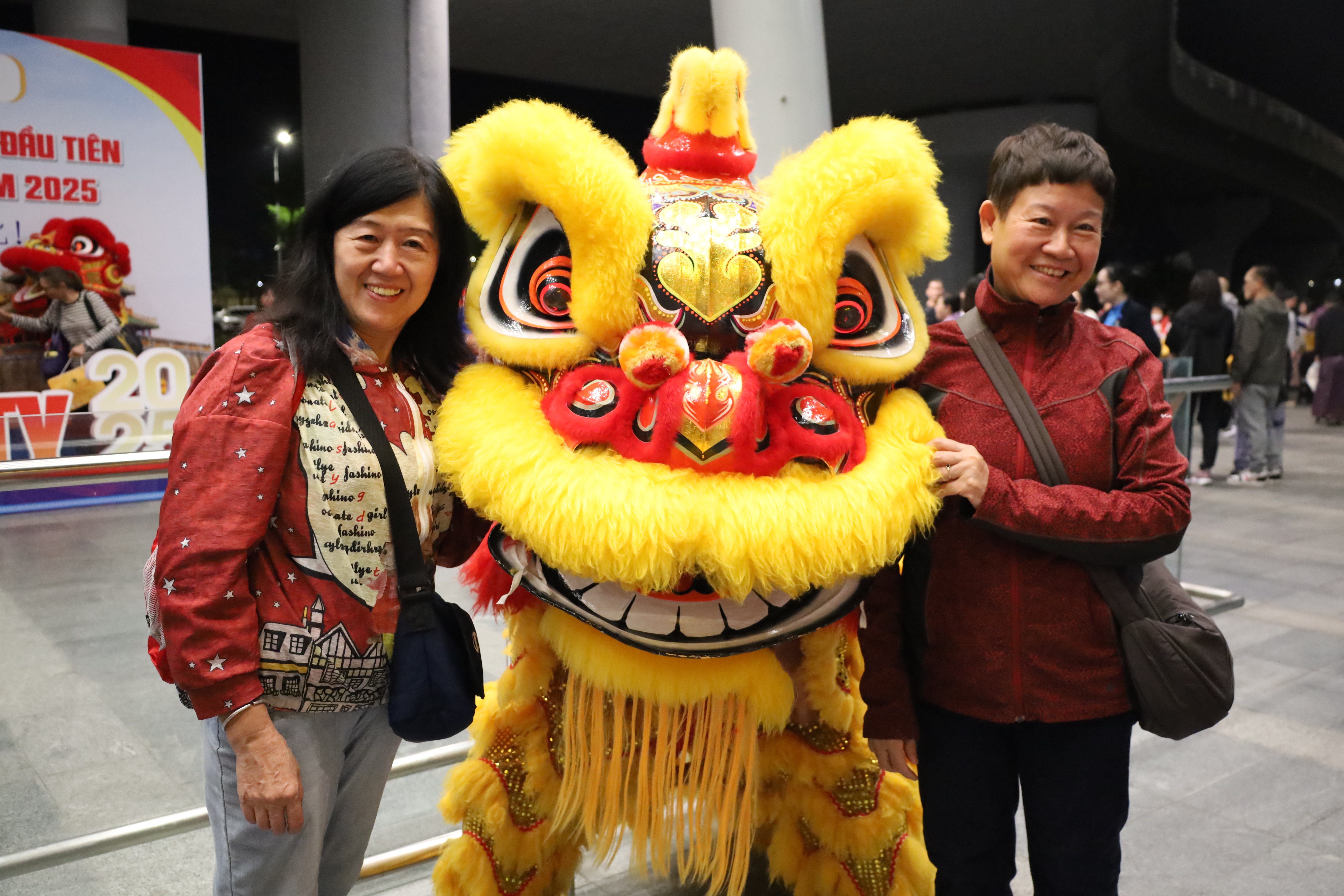 | Guests took souvenir photos with the lion dance troupe at the program |
