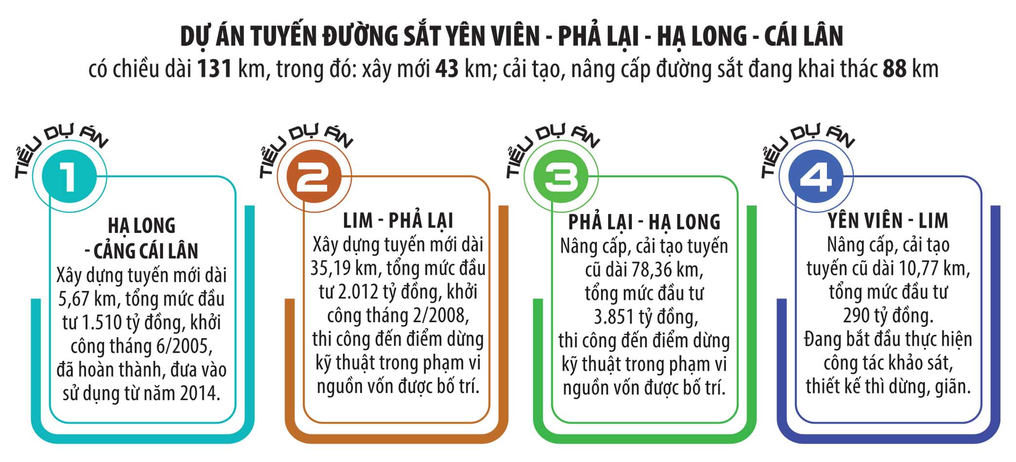 It should be added that the Yen Vien - Pha Lai - Ha Long - Cai Lan Railway Project was approved for investment by the Prime Minister in Document No. 75/CP-CN, dated January 9, 2004, using government bond capital. The project has a total length of 131 km, starting at Yen Vien station and ending at Cai Lan port with a total investment of 7,663 billion VND.