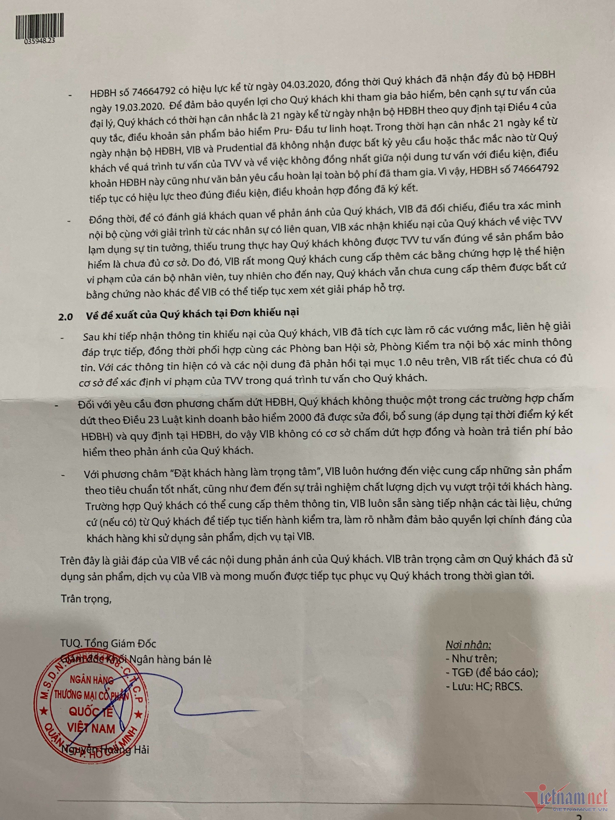 In a response letter to the customer on March 30, VIB stated that Ms. Dao had a 21-day period to consider the contract as stipulated in Article 4 of the terms and conditions of the "Pru-Flexible Investment" insurance product.