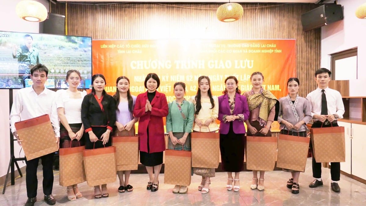 Leaders of the Department of Foreign Affairs and Lai Chau College presented gifts to Lao students at the exchange program to celebrate the anniversary of the establishment of Vietnam - Laos diplomatic relations.