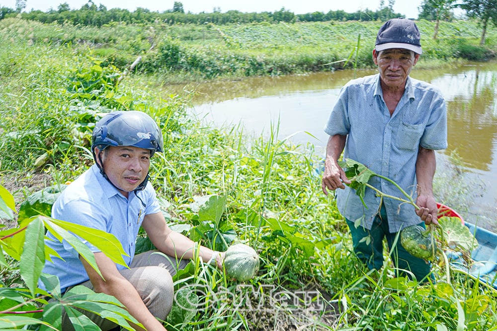 Mr. Vo Thanh Quoc (right) grows pumpkin on the canal bank to increase income.