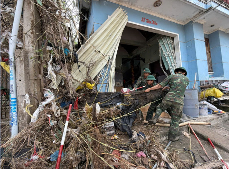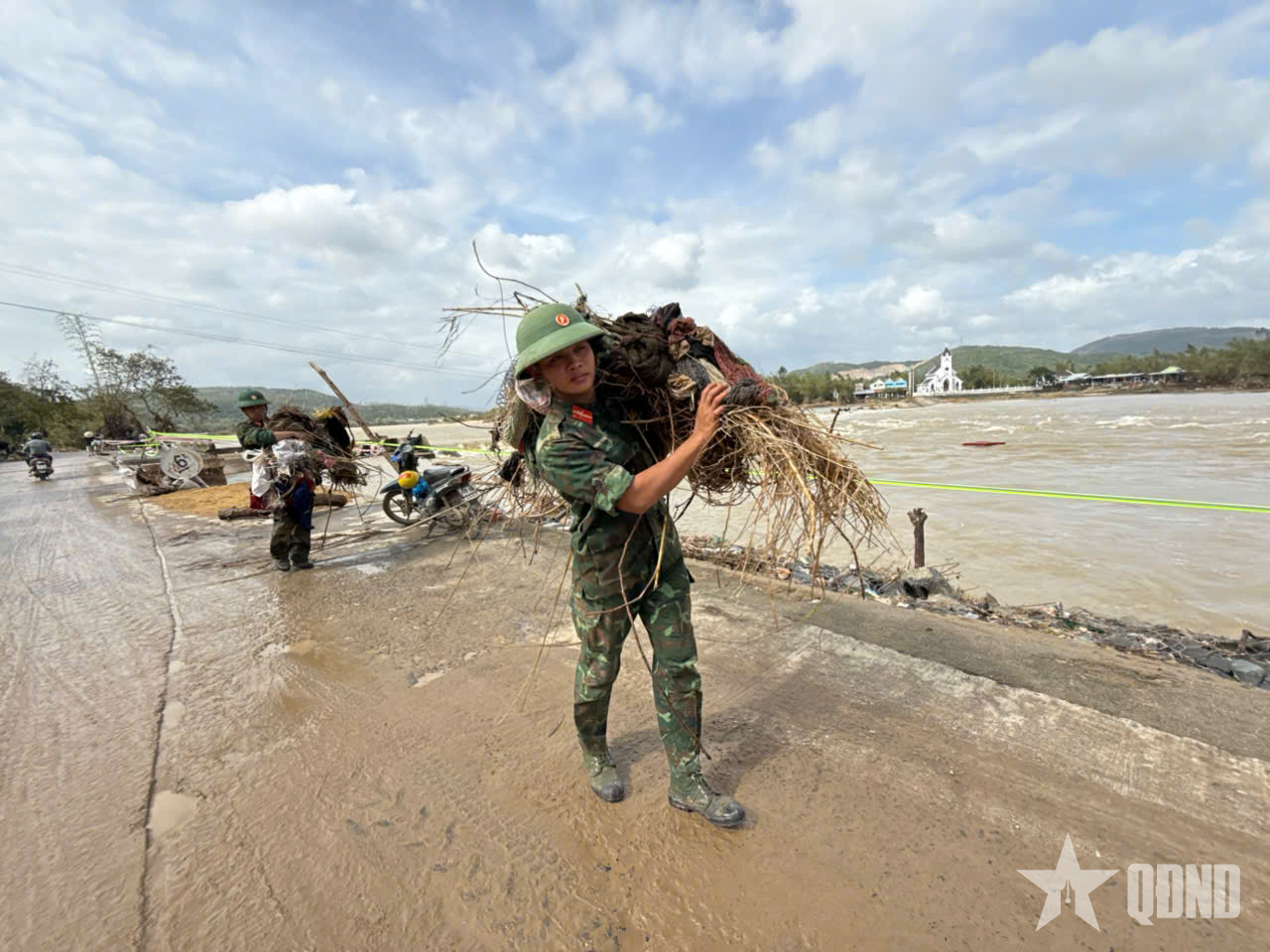 | Soldiers of Regiment 95, Division 2, Military Region 5 help people in Quang Duc village (Tuy An Dong) overcome the consequences of floods. |