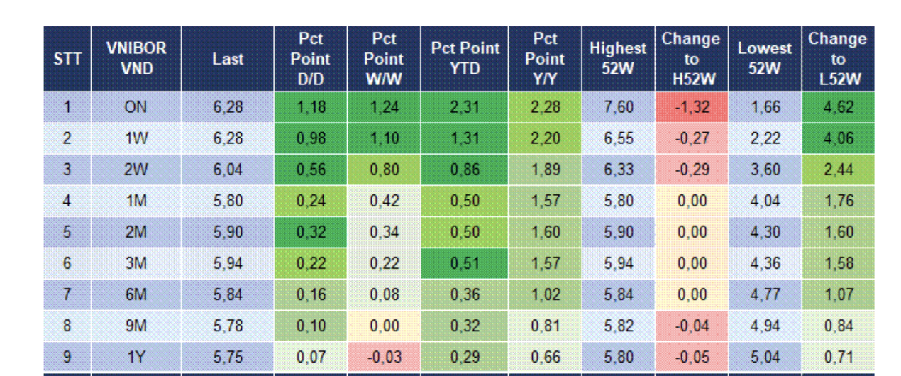 According to the Vietnam Interbank Market Research Association, VND interest rates increased simultaneously in all short terms compared to the previous session:
