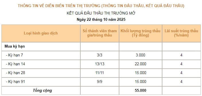 The State Bank of Vietnam lent its members a total of VND55,000 billion through the mortgage lending channel (forward purchase) with an interest rate of 4%/year. The winning bid structure was recorded in many terms: