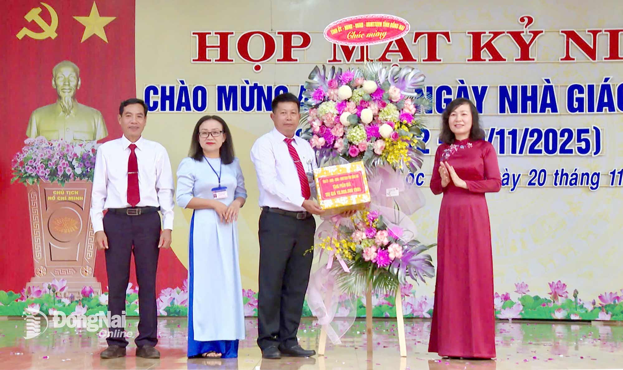 | Deputy Secretary of the Provincial Party Committee, Chairwoman of the Vietnam Fatherland Front Committee of Dong Nai province Huynh Thi Hang presented a flower basket from the Provincial Party Committee - People's Council - People's Committee - Vietnam Fatherland Front Committee of Dong Nai province to congratulate the school. Photo: Tran Canh |