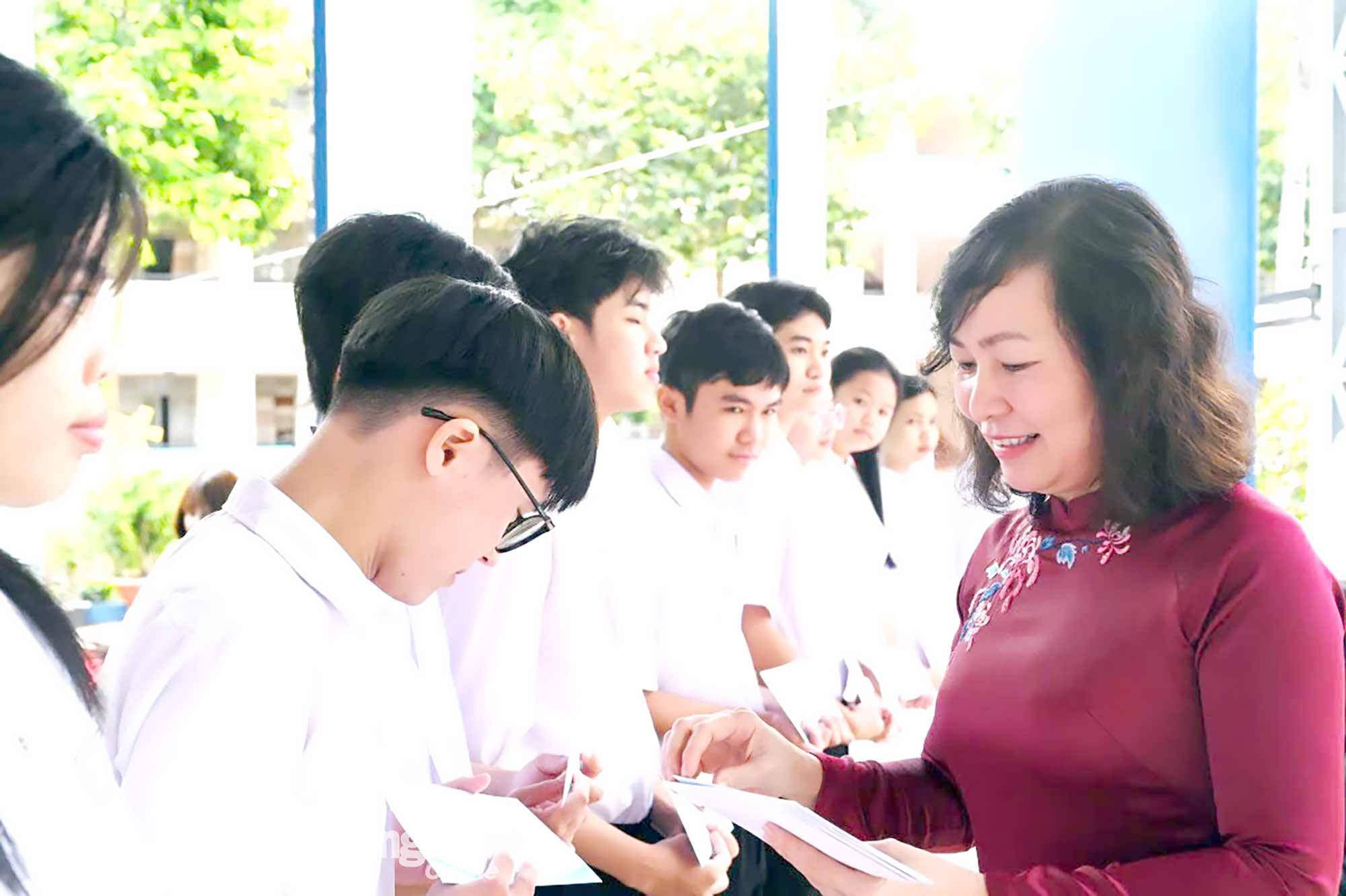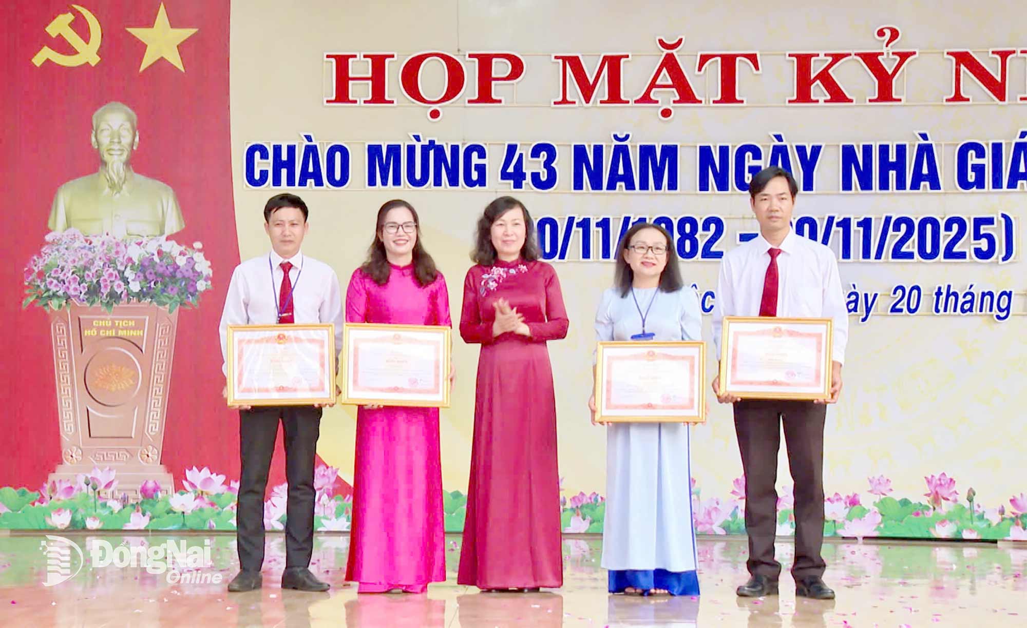 | Deputy Secretary of the Provincial Party Committee, Chairwoman of the Vietnam Fatherland Front Committee of Dong Nai province Huynh Thi Hang awarded teachers with outstanding achievements. Photo: Tran Canh |