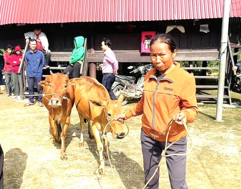 Similarly, Ms. Ho Thi Le (of the Ca Dong ethnic group, Tra Han village) received two cows from the City Farmers' Association. Ms. Le's family is classified as a poor household, with four young children, living in an old, dilapidated house. Her work tapping rubber trees provides an unstable income, making life difficult. Thanks to the donated cows, Ms. Le has better conditions to develop livestock farming, creating a stable income for her family.