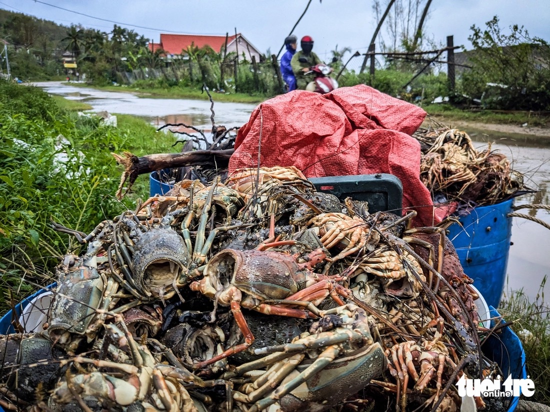 Lobster farmers in the lobster capital of Song Cau regret their loss, scooping up dead lobsters, peeling off their heads, and selling them off at a loss to recoup the little capital they had invested - Photo: TAN LUC