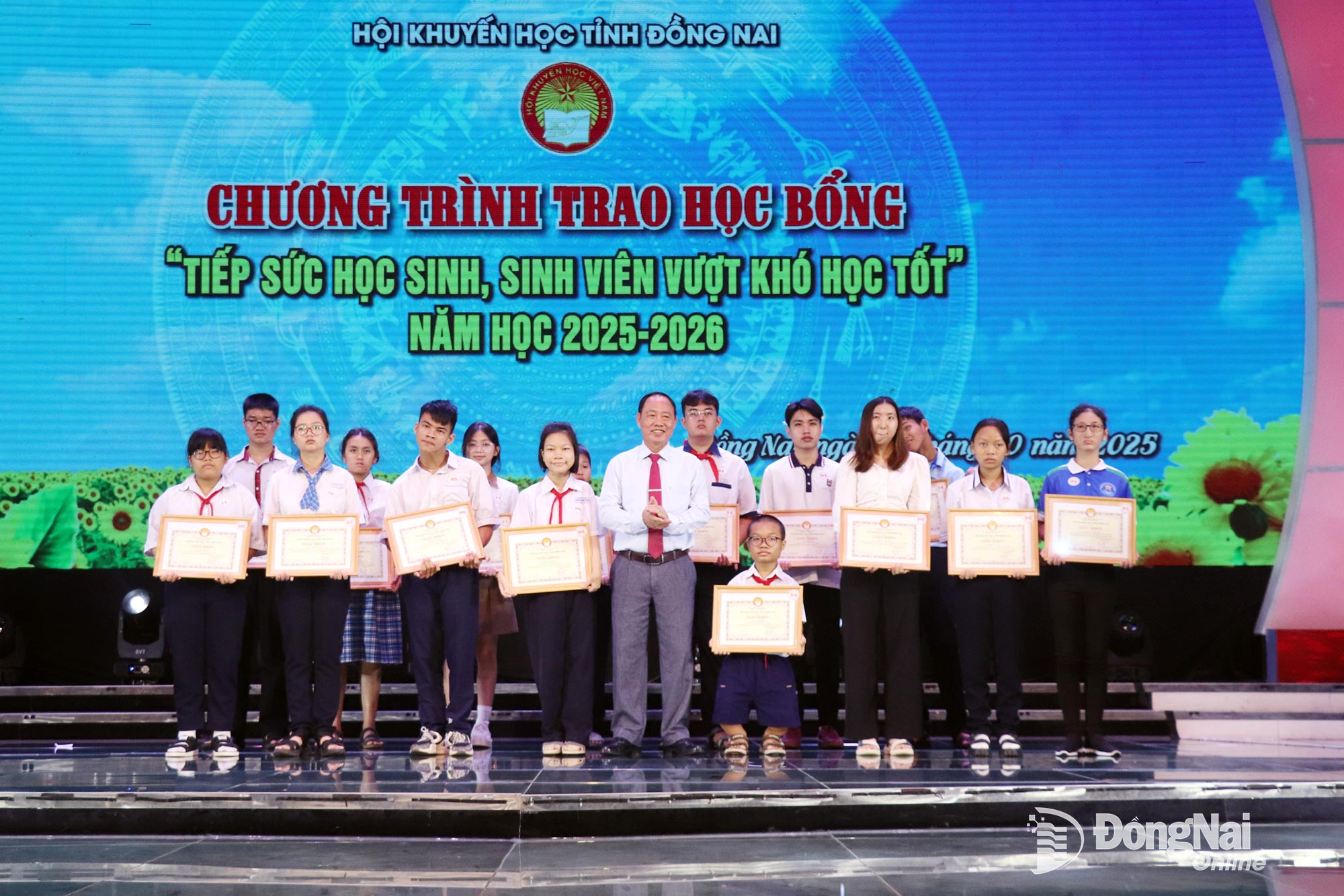 Member of the Provincial Party Standing Committee, Vice Chairman of Dong Nai Provincial People's Committee Le Truong Son presents scholarships to students. Photo: Hai Yen |
