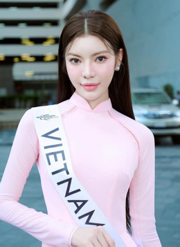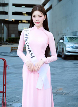 Vietnamese representative Nguyen Tuong San was graceful in a pink ao dai, calling out the country's name, showing off her pure beauty with long hair and light makeup.