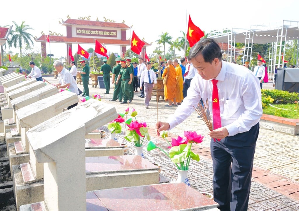 Following the memorial service, the leaders of the Ca Mau Provincial Party Committee, People's Council, People's Committee, and Vietnam Fatherland Front Committee, along with other delegates, offered incense at each grave of the heroic martyrs at the Provincial Martyrs' Cemetery.