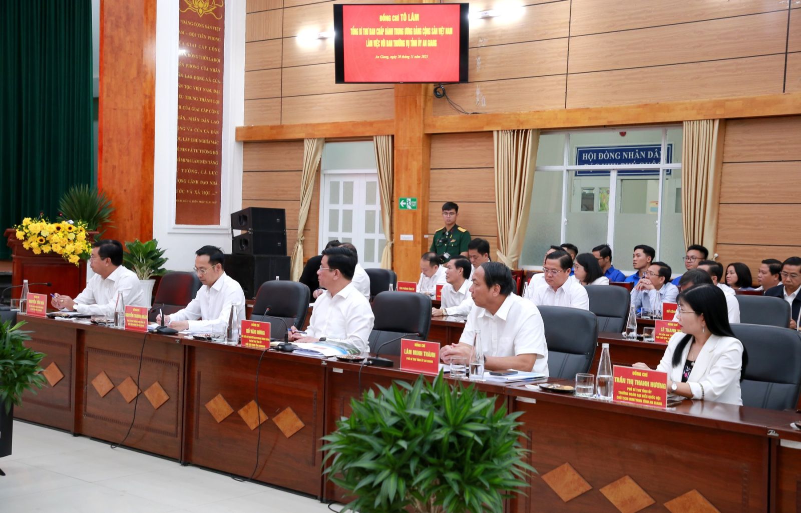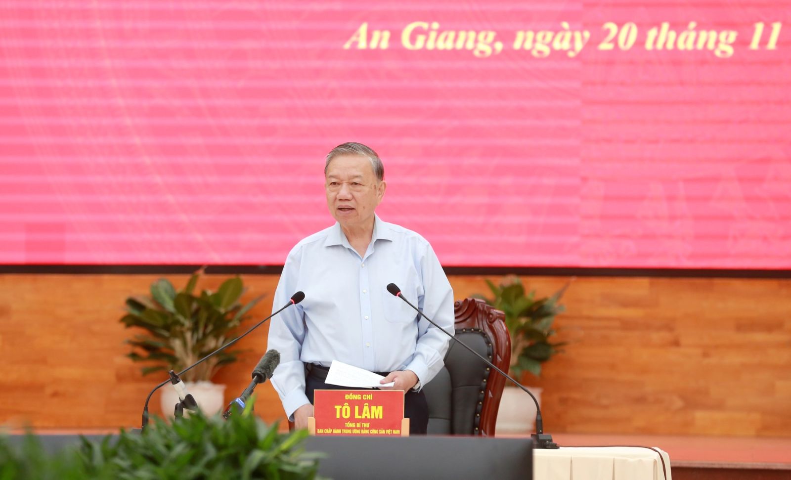 Speaking at the meeting, General Secretary To Lam expressed his joy in returning with the Central Working Delegation to visit and work with An Giang province after the merger of An Giang-Kien Giang - a land rich in revolutionary traditions, imbued with Southern culture, with a particularly important geostrategic position, being both the source province of the Mekong River and the gateway to the West Sea of the Fatherland, with the Phu Quoc special economic zone developing strongly.