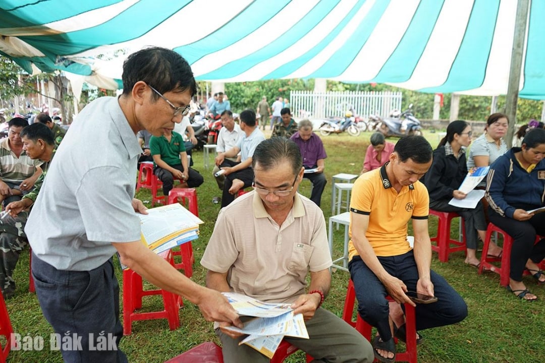 | Los funcionarios del seguro social en el distrito de Krông Năng están difundiendo información sobre las pólizas de seguro de salud a la población local. |