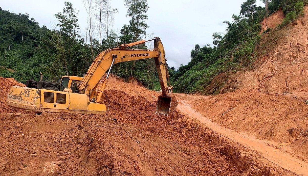 Phuoc Manh Construction and Trading Company Limited construye y limpia deslizamientos de tierra para superar las consecuencias de los desastres naturales, manejar los atascos de tráfico y garantizar el tráfico en la ruta DT606, sección km0+000 - km25+000.
