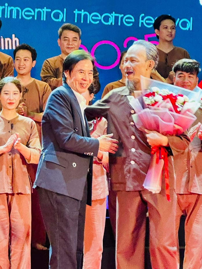 El artista popular Giang Manh Ha, vicepresidente de la Asociación de Artistas Teatrales de Vietnam, entregó flores para felicitar a los artistas que participaron en la obra "El hombre de las sandalias de goma".