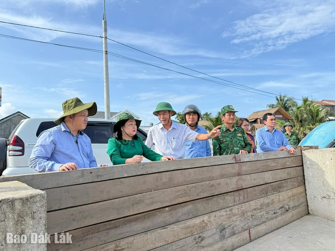 | La camarada Cao Thi Hoa An, vicesecretaria permanente del Comité Provincial del Partido y presidenta del Consejo Popular Provincial, inspeccionó el estado del sistema de prevención y control de tormentas n.° 13 en el terraplén de My Quang (comuna de Tuy An Nam). Foto: T. Thao |
