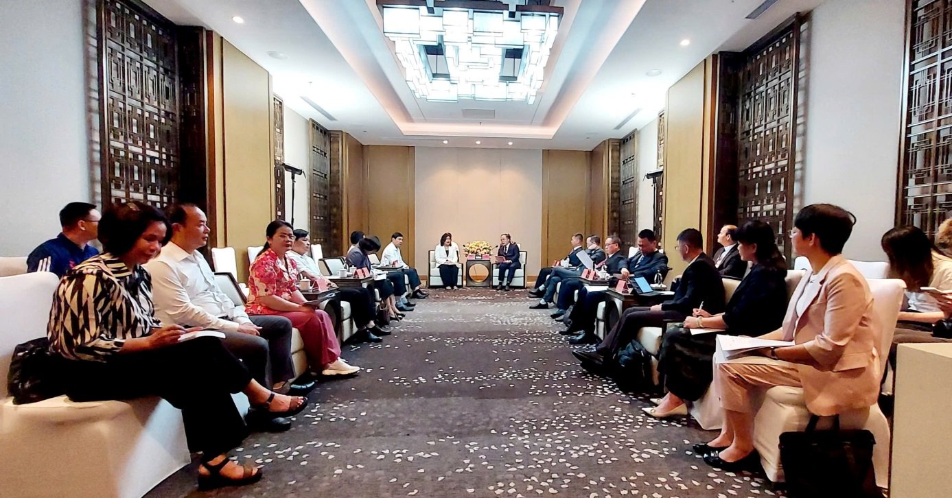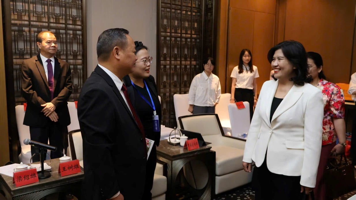La Sra. Trinh Tuyet Mai, directora del Departamento Provincial de Asuntos Exteriores, conversó en el marco de la reunión con los líderes del Gobierno de la ciudad de Van Phu, provincia de Guangdong, China. Foto: Vu Giang