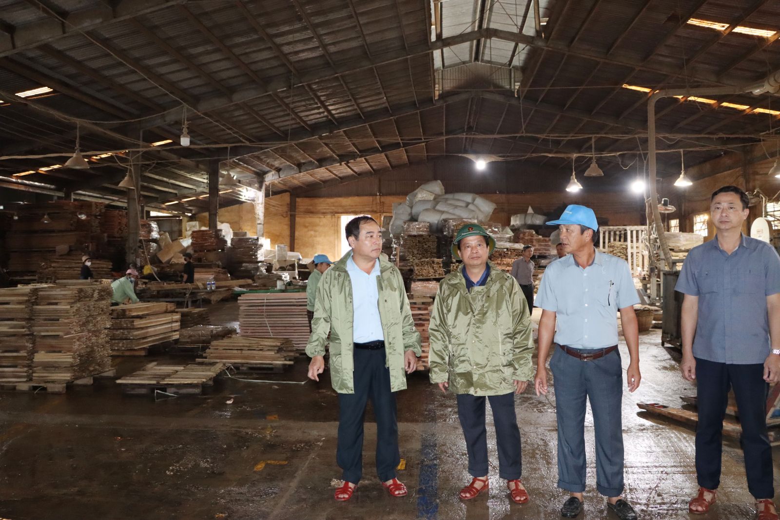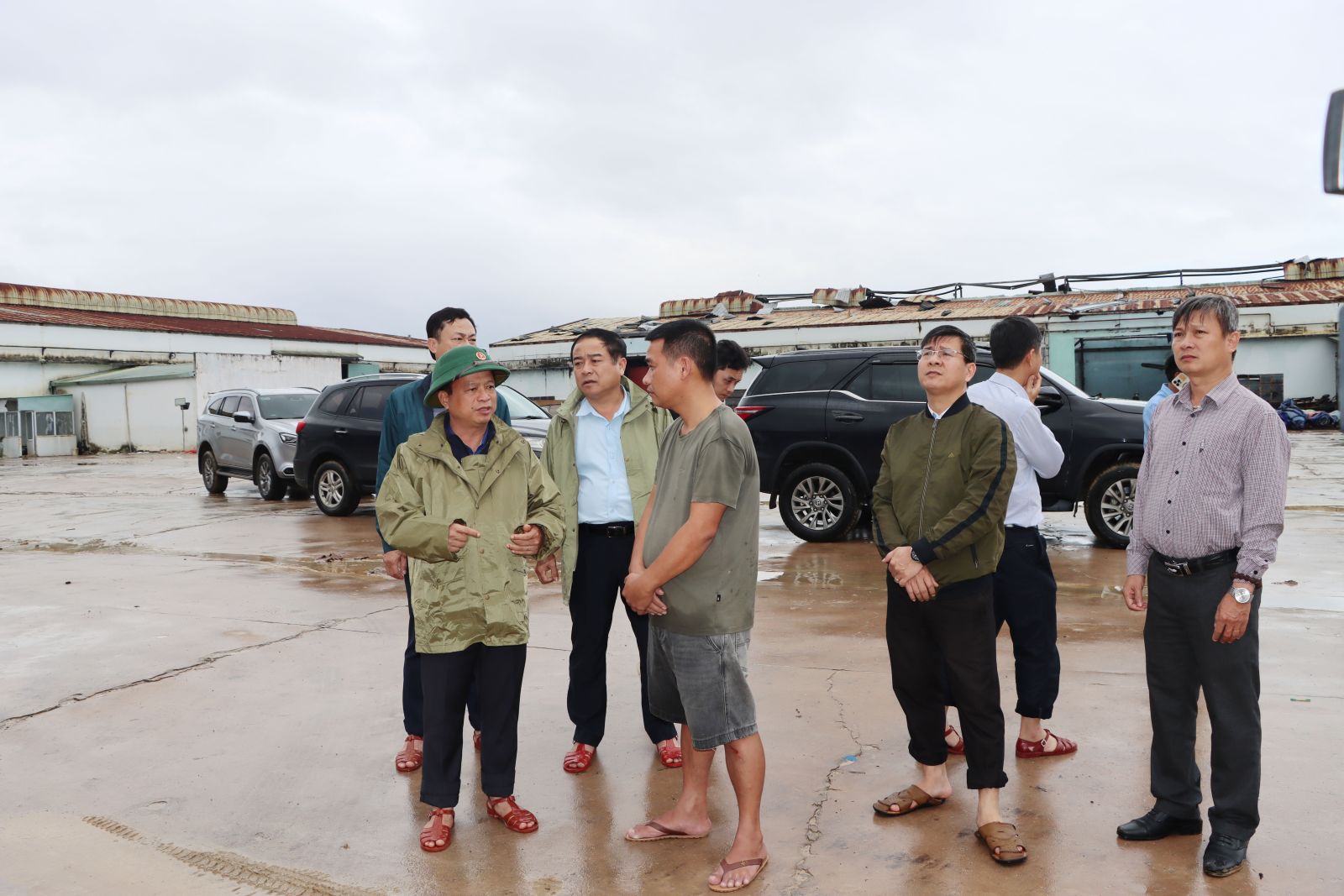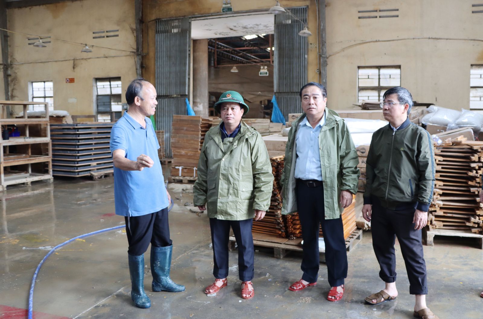 El vicepresidente permanente del Comité Popular Provincial, Nguyen Tuan Thanh, inspeccionó la situación de los daños en Quy Nhon Cushion JSC Enterprise.