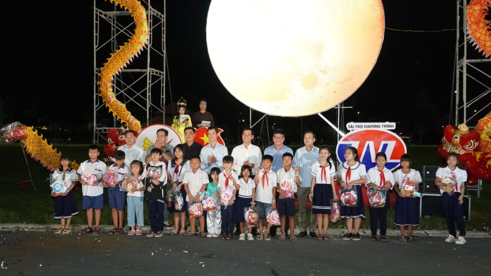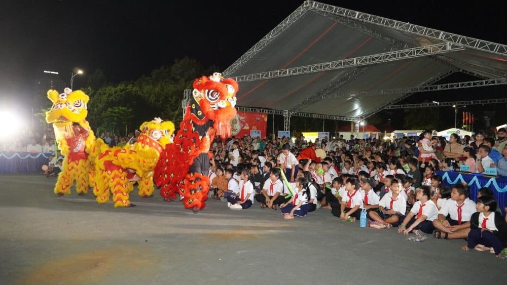 Un punto culminante especial del programa es la luna en el escenario principal, diseñada con la caja de luz más grande de Tay Ninh, con un diámetro de 5 m, creando un espacio brillante y único, que ayuda a los niños a divertirse y preservar recuerdos.