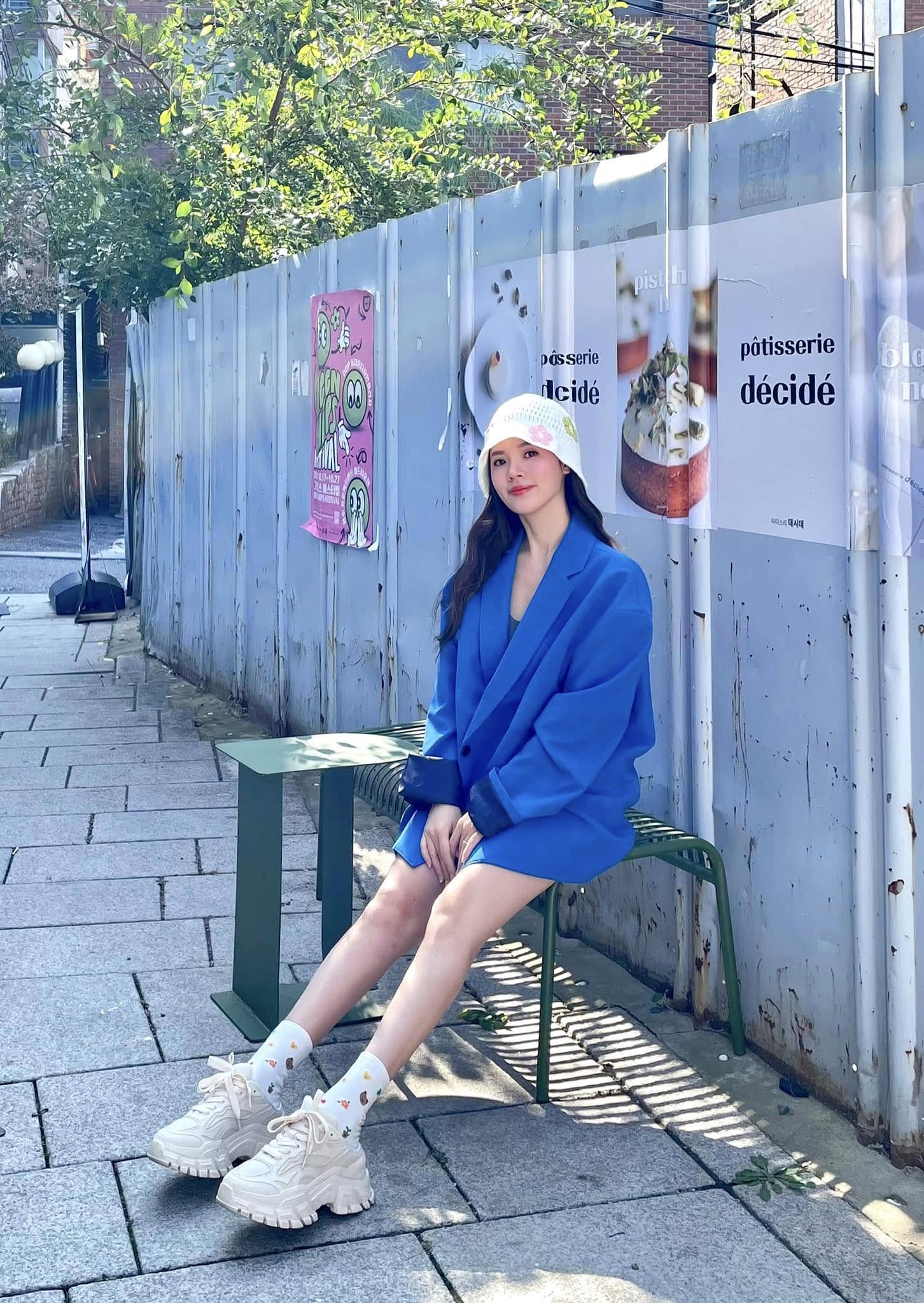 Midu destaca en prendas de moda con colores vibrantes, como el blazer azul. Midu lleva esta chaqueta con un estilo que oculta los pantalones, añadiendo así un toque femenino y seductor al conjunto. El conjunto se vuelve más juvenil y dinámico gracias al sombrero de pescador y las zapatillas blancas.