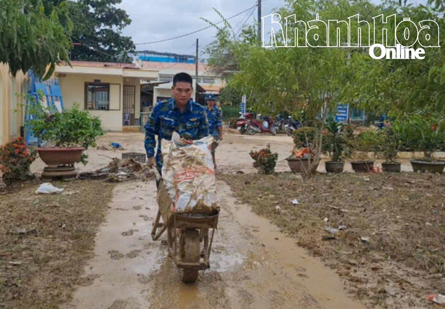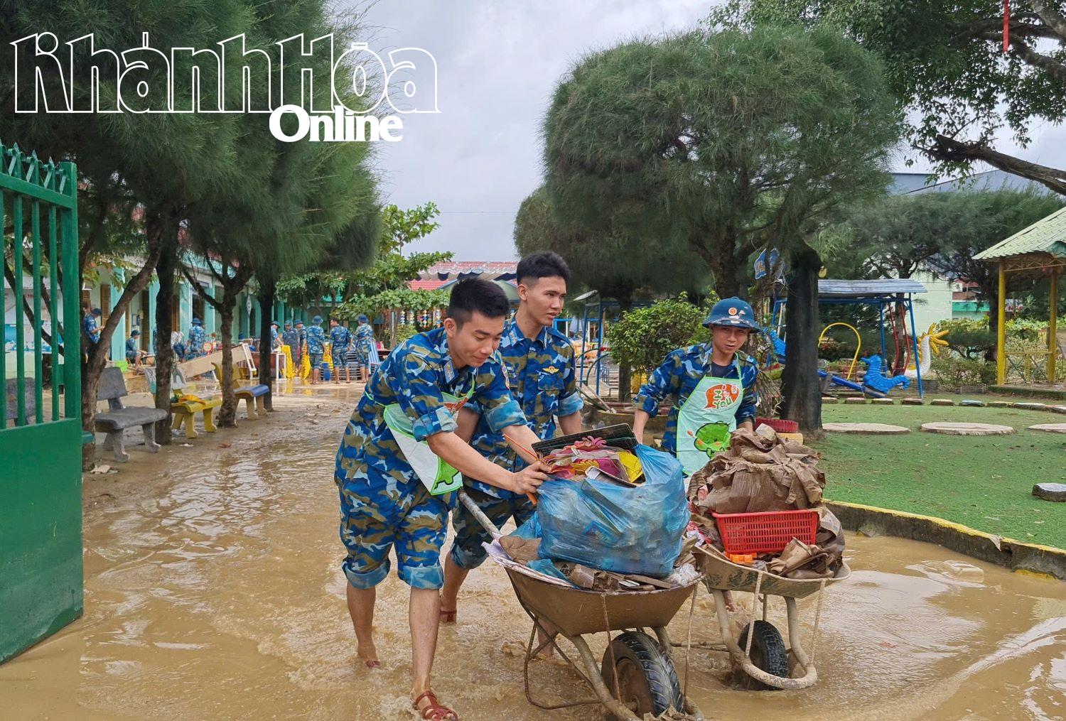 | Oficiales y soldados limpian activamente el jardín de infancia de Dien Phuoc. |