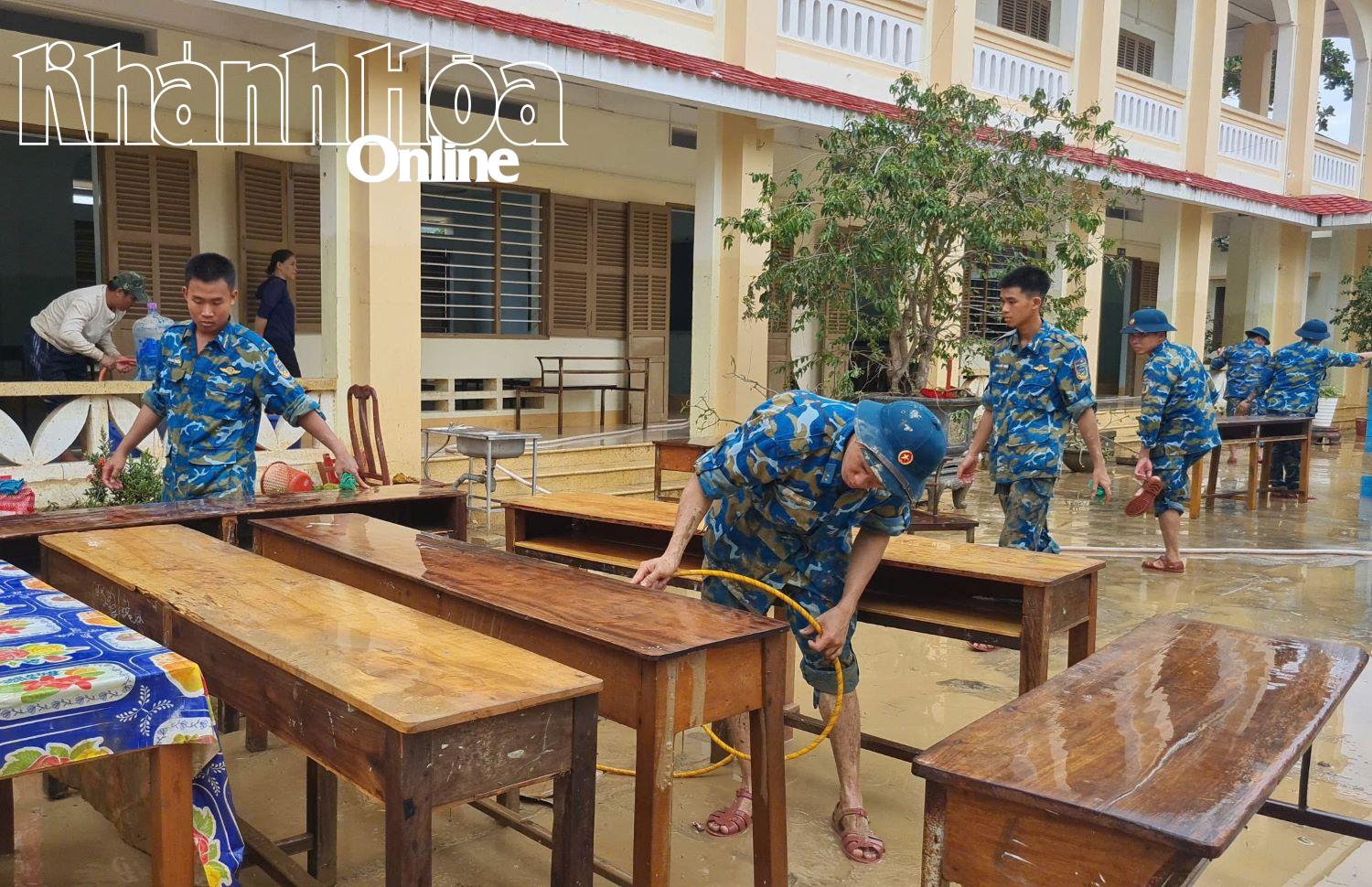 En la cercana Escuela Secundaria Nguyen Thai Hoc, decenas de oficiales y soldados del Regimiento 591, División de Defensa Aérea 377, también ayudaron activamente a limpiar la escuela, dragar el lodo del patio, fregar las paredes y pisos de las aulas, reorganizar las mesas y sillas, transportar material didáctico, libros y documentos, y recoger la basura. Las aulas con equipos eléctricos fueron revisadas, secadas y se garantizó su seguridad antes de ser entregadas a la escuela.