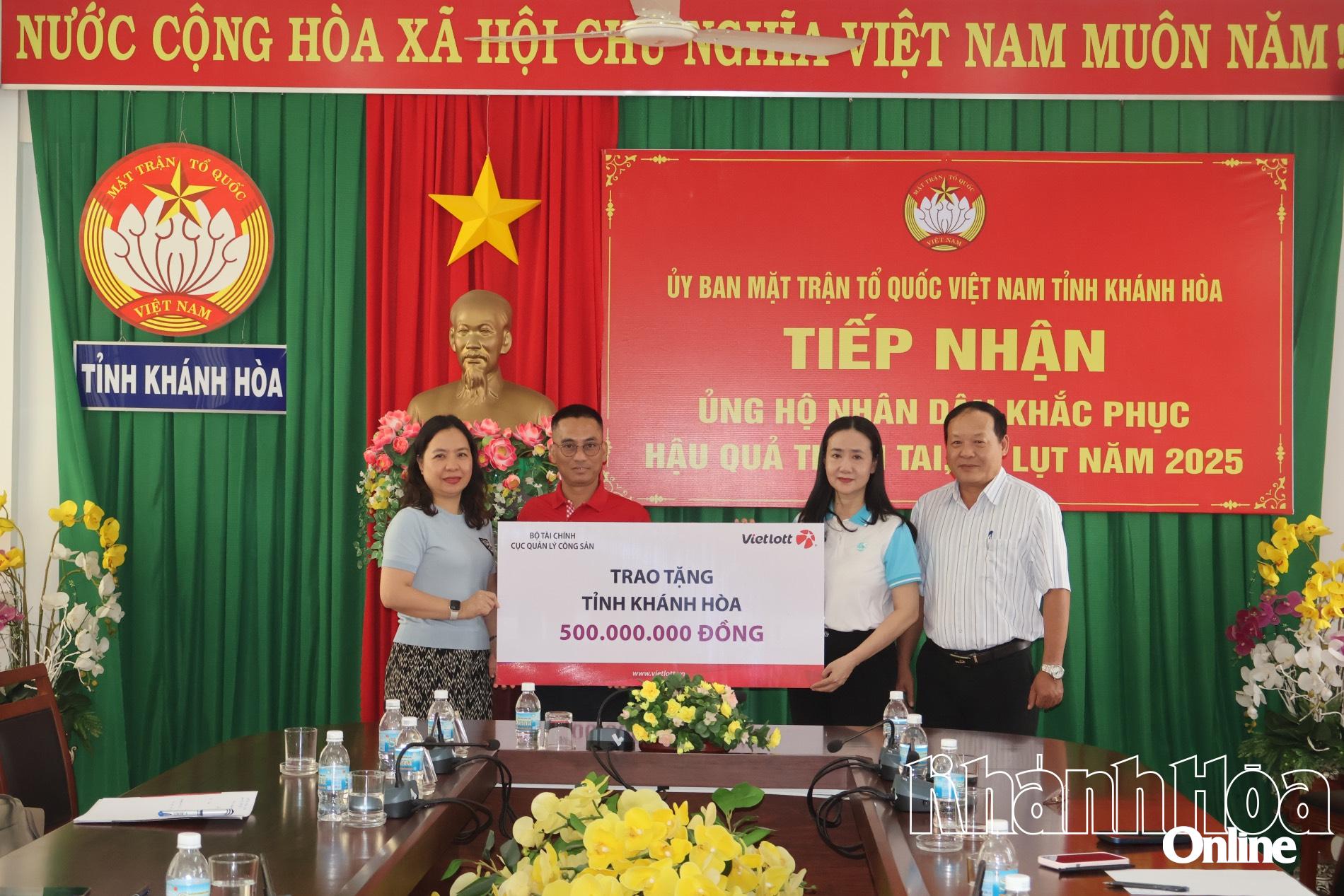 | نمایندگان اداره مدیریت داراییهای عمومی (وزارت دارایی ویتنام) و ویتلات، یک تابلوی نمادین به مبلغ ۵۰۰ میلیون دونگ ویتنامی برای حمایت از افراد آسیبدیده از سیل ارائه کردند. رهبران کمیته استانی جبهه میهنی ویتنام. |