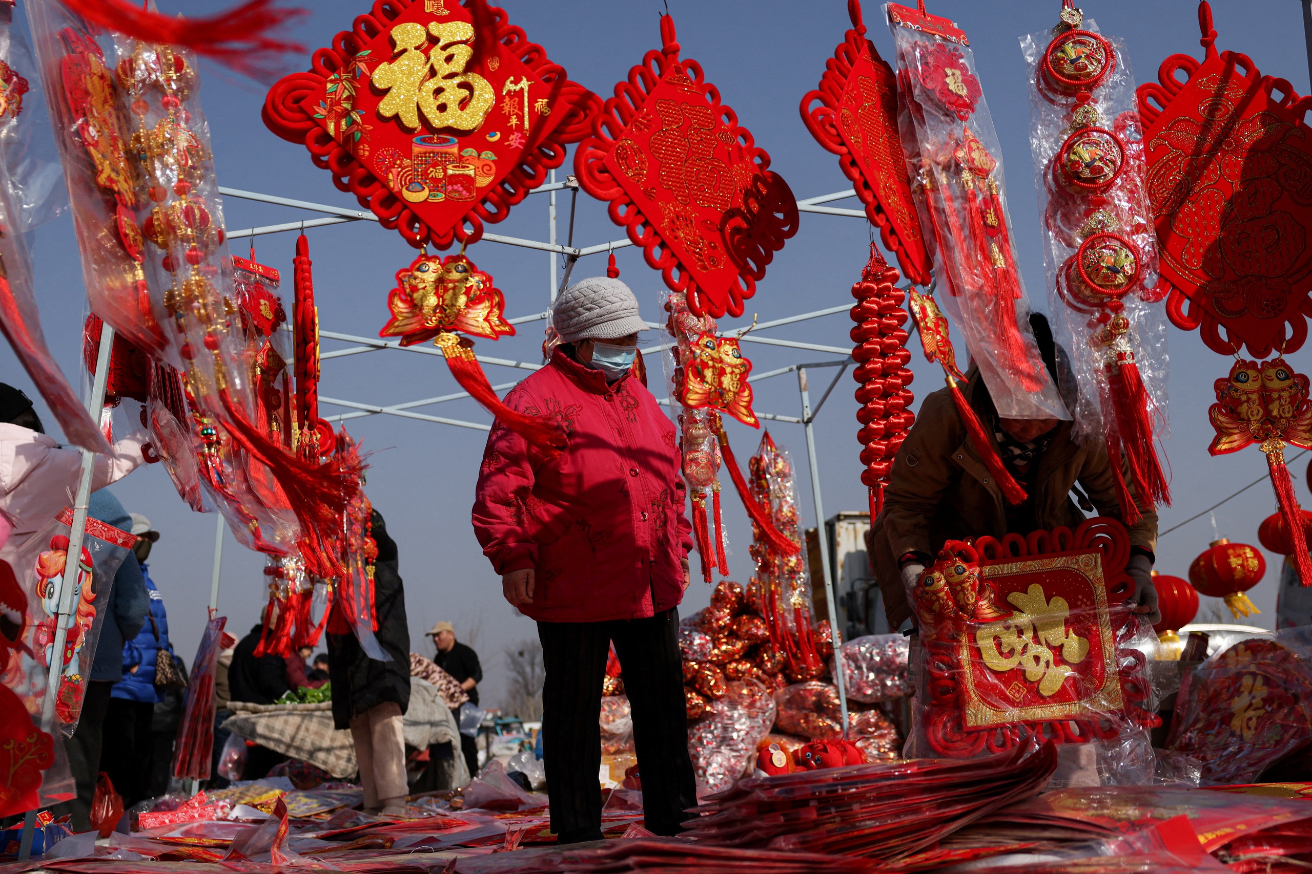 بازاری برای فروش تزئینات سال نو قمری در پکن، چین.