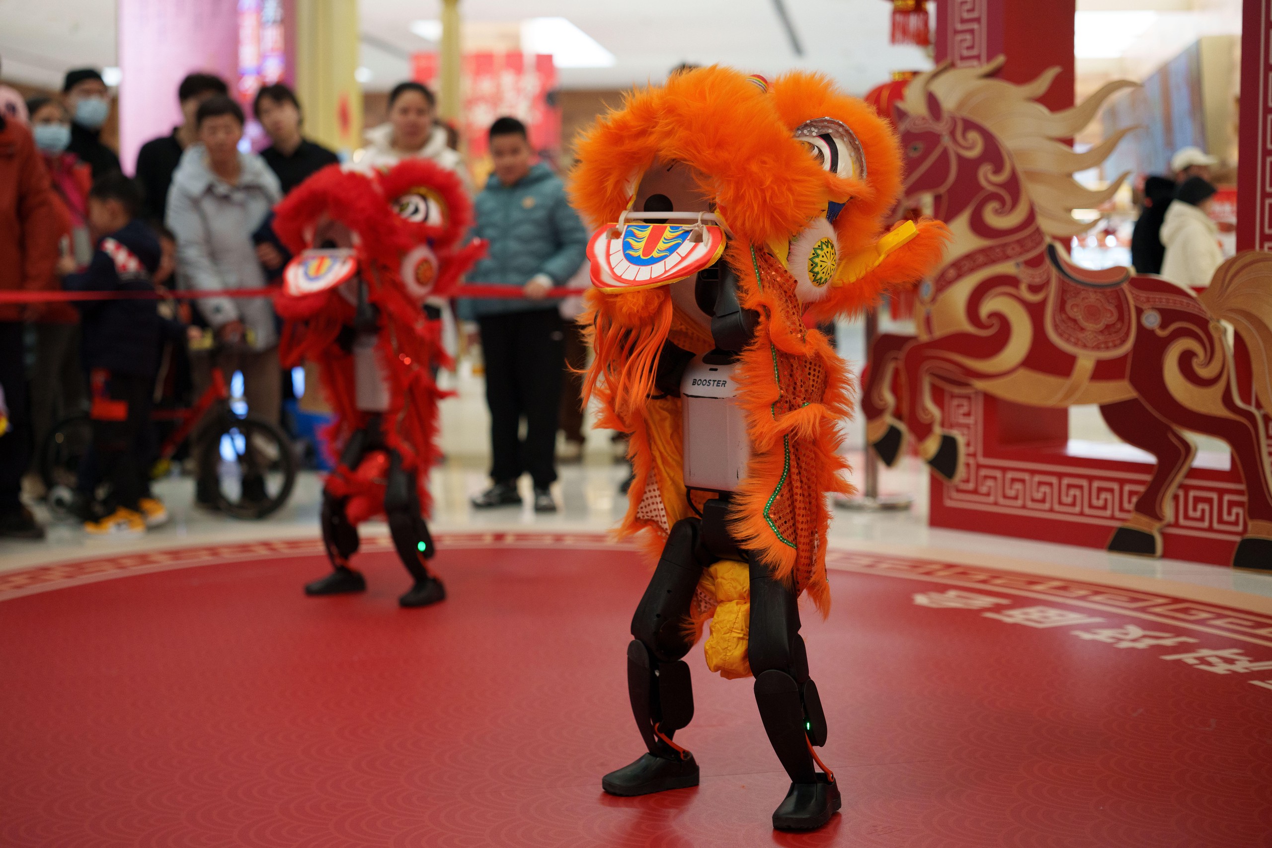 رباتها در ۱۳ فوریه در پکن، چین، رقص شیر اجرا میکنند.
