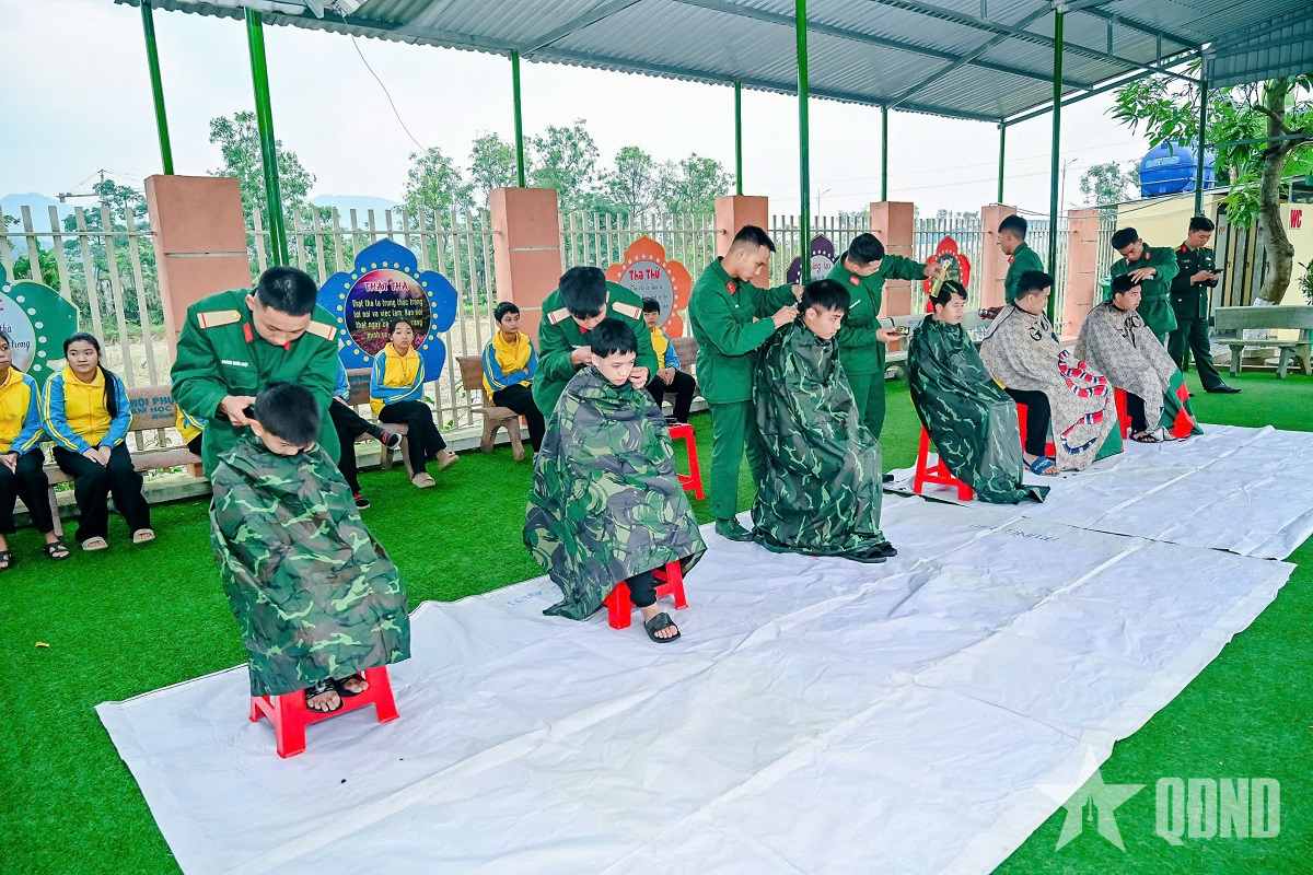 | سربازان در مرکز حمایت از توسعه و آموزش فراگیر برای کودکان دارای معلولیت هونگ لین (استان ها تین) موهای دانشآموزان را کوتاه میکنند. |