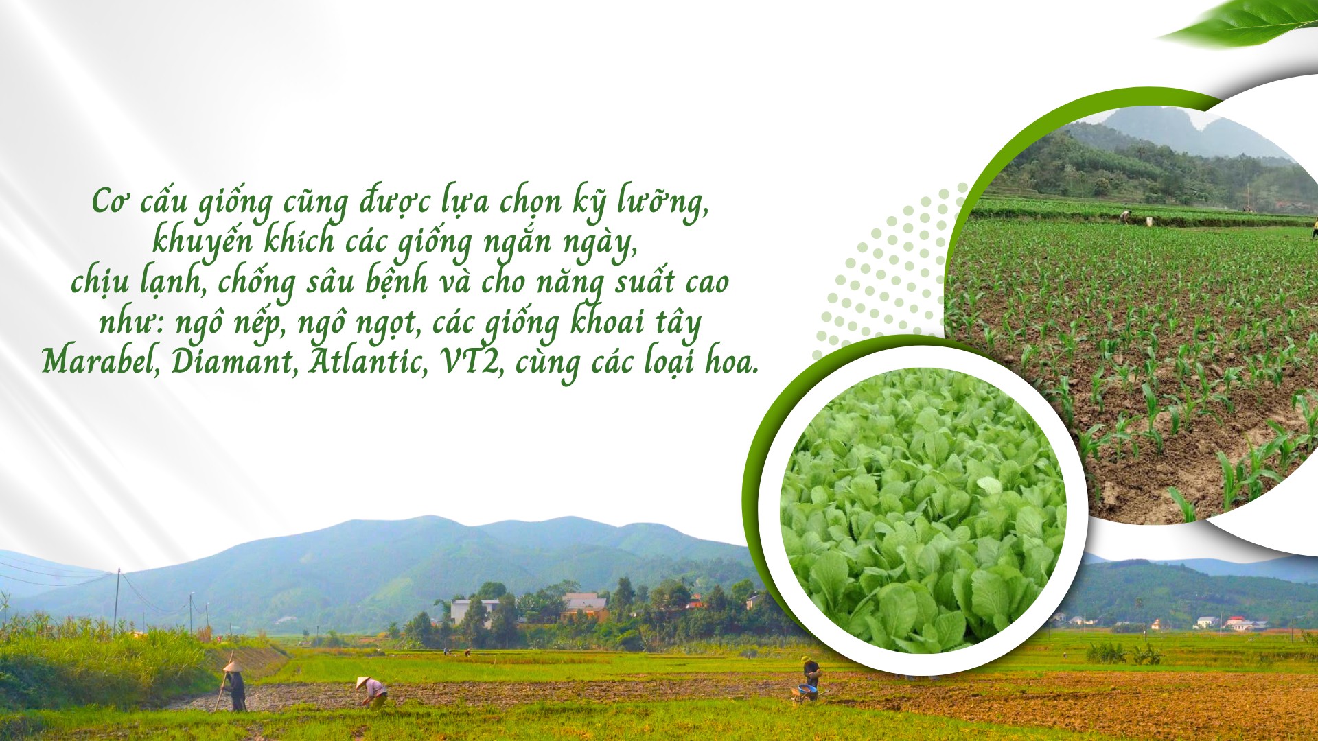 ساختار گونهها نیز با دقت انتخاب شده است و گونههای کوتاهمدت، مقاوم به سرما، مقاوم به آفات و پربازده مانند: ذرت مومی، ذرت شیرین، مارابل، دیامان، آتلانتیک، گونههای سیبزمینی VT2 و گونههای گل: سوسن، میخک، ژربرا، سوسن... را تشویق میکند. بخش کشاورزی تبلیغات را تقویت میکند، کشاورزان را به سمت استفاده از پیشرفتهای فنی، گسترش سطح تولید در جهتی ایمن و ارگانیک، استفاده از گلخانهها، سیستمهای آبیاری کممصرف، مکانیزه کردن آمادهسازی زمین و برداشت برای کاهش هزینهها و بهبود بهرهوری هدایت میکند.