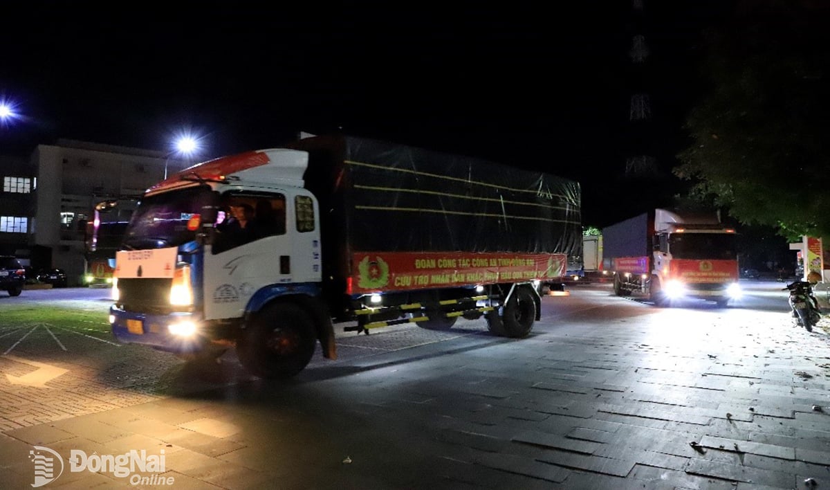 | کاروانی از پلیس استان دونگ نای در حال حمل کالا و مایحتاج مردم در مناطق سیل زده. عکس: HB |