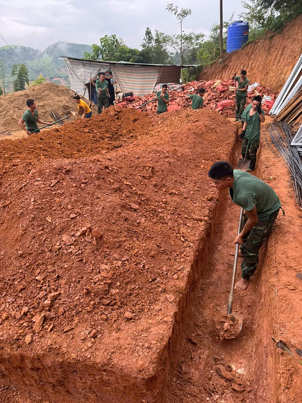 افسران و سربازان هنگ ۸۲، لشکر ۳۵۵، منطقه نظامی ۲، از مردم روستای پا وات، کمون مونگ لوان، استان دین بین ، برای ساخت خانه حمایت میکنند. |