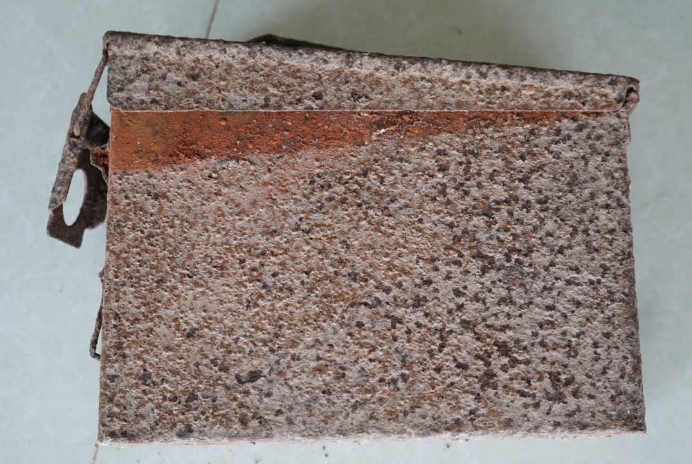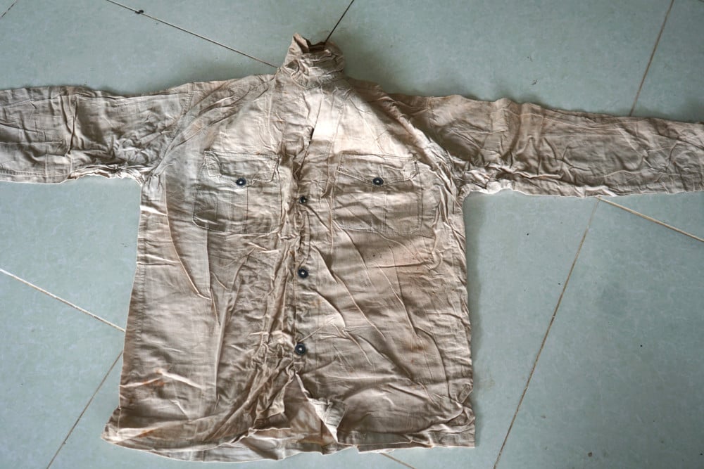 در ۲۵ سپتامبر ۲۰۲۵، آقای ترانگ جعبه مهمات مذکور را برای نشان دادن به ما بیرون آورد. اگرچه جعبه مهمات با دقت نگهداری شده بود، اما پس از سالها تحت تأثیر عواملی مانند رطوبت، دما و غیره، قسمت بیرونی آن کاملاً زنگ زده بود. آقای ترانگ با باز کردن درب جعبه، دو پیراهن خاکی رنگ را بیرون آورد و آنها را روی کف آجری پهن کرد. در طول سالها، پیراهنها به رنگ خاکستری-زرد و چروکیده درآمده بودند.