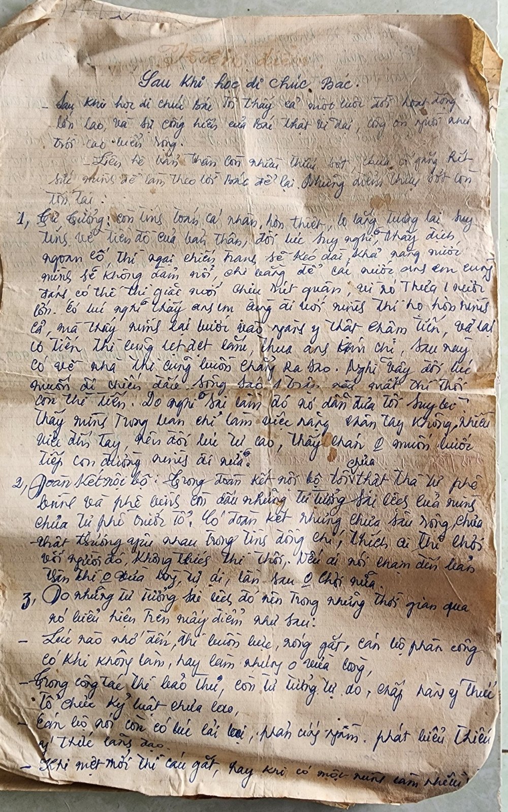 یکی دیگر از اسناد قابل توجه، خودارزیابی پس از مطالعه وصیتنامه عمو هو است. نویسنده نوشت: «پس از مطالعه وصیتنامه عمو هو، میبینم که تمام زندگی او که سرشار از فعالیتها و فداکاریهای بزرگ بود، واقعاً باشکوه است، شایستگیهای او به بلندی آسمان و دریاست. در مورد خودم، هنوز کاستیهای زیادی دارم، تمام تلاشم را نکردهام که از سخنان عمو هو پیروی کنم.»
