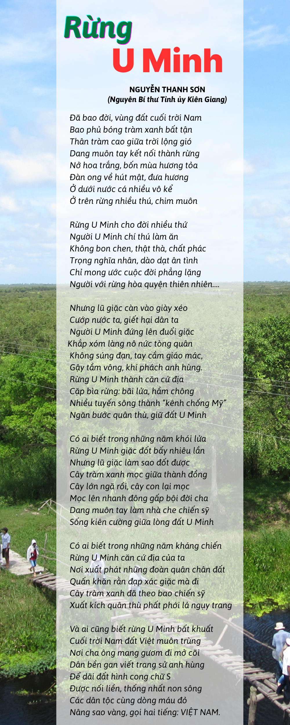 جنگل یو مین - نمادی از سرزندگی و ارادهی شکستناپذیر سرزمینی در انتهای جنوب - توسط دبیر سابق کمیتهی حزبی استان کین گیانگ، نگوین تان سون، در شعری به تصویر کشیده شده است که هم سرشار از عشق به سرزمین و مردم است و هم سالهای قهرمانانهی جنگ را به یاد میآورد.