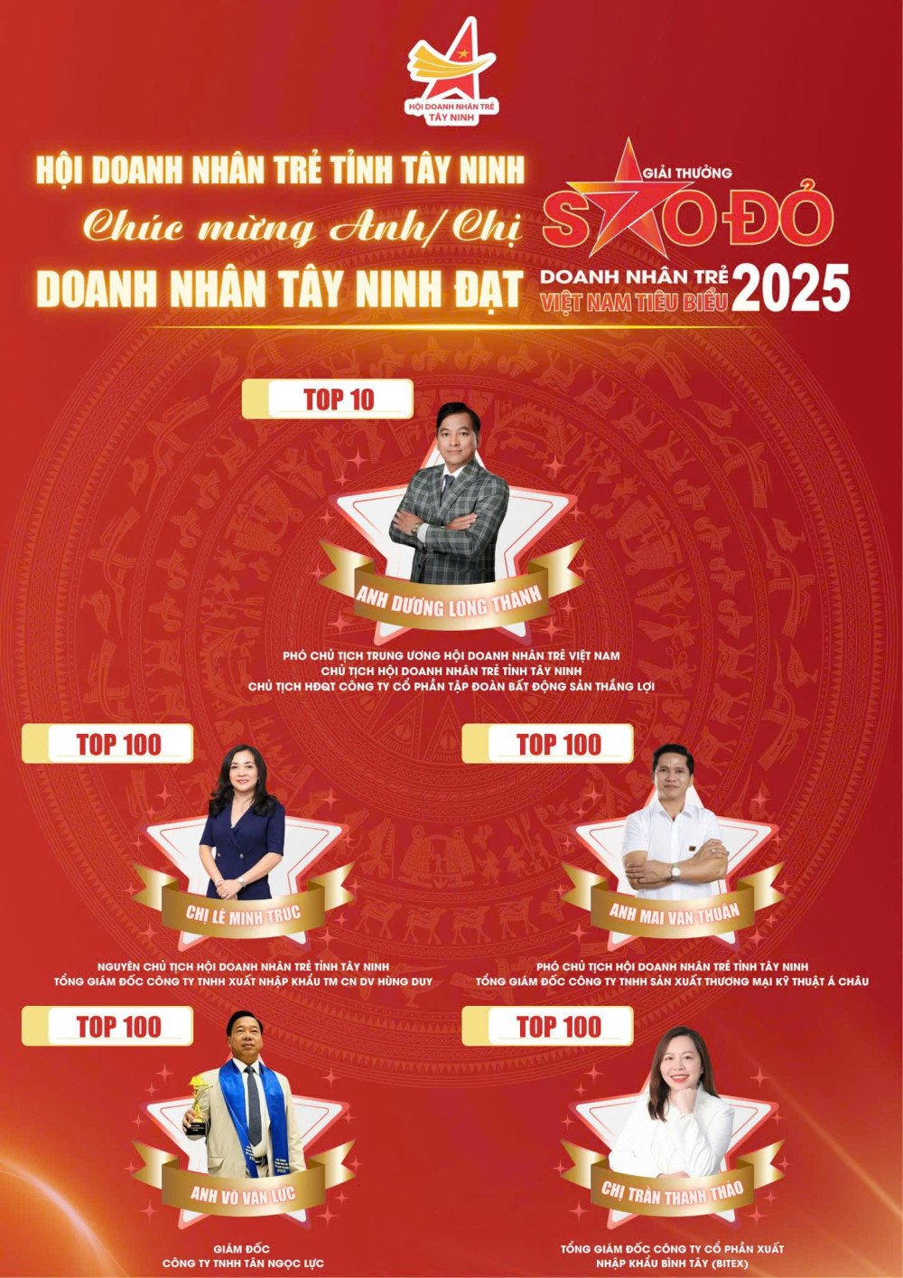 منبع: https://baolongan.vn/tay-ninh-co-1-sao-do-4-doanh-nhan-lot-top-100-doanh-nhan-tre-viet-nam-tieu-bieu-2025-a207289.html
